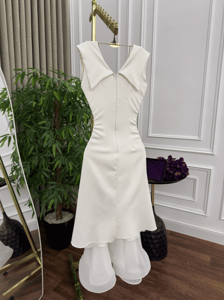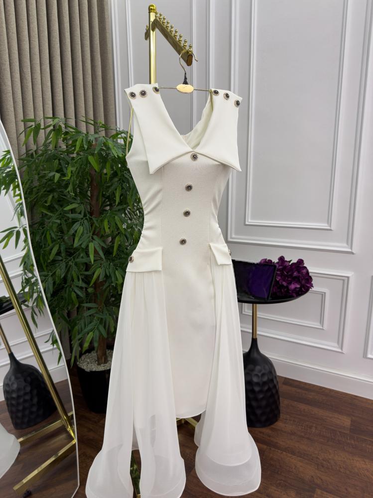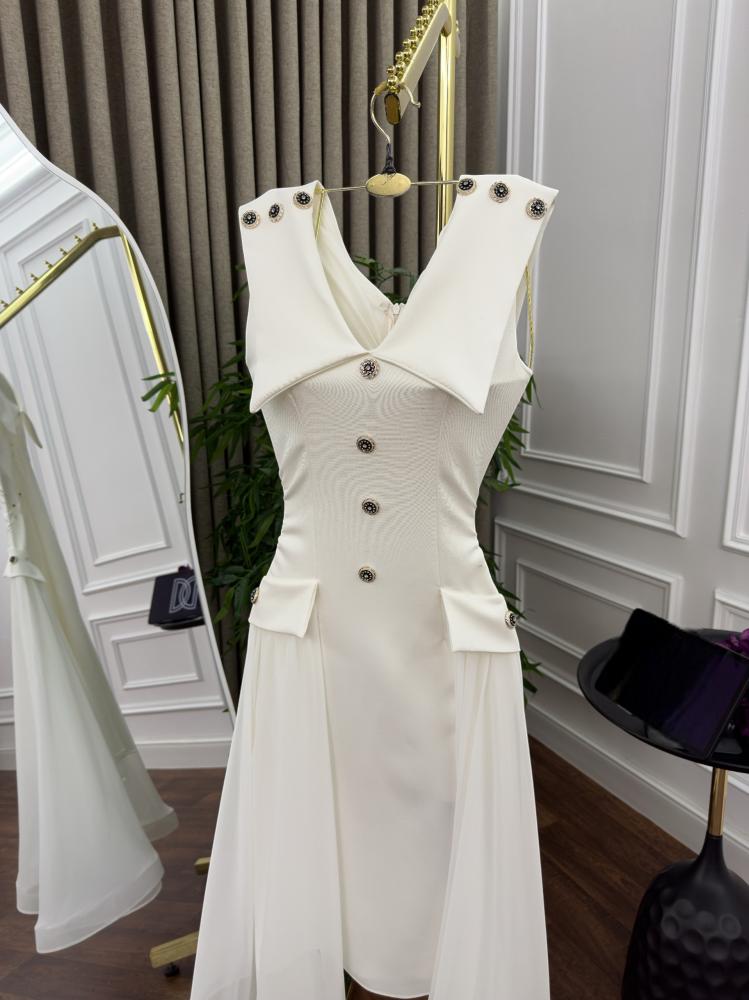 فستان ناعم بخامة الباربي والشيفون بياقة على شكل V من الامام والخلف بأكتاف كت مزينة بأزرار رائعة .