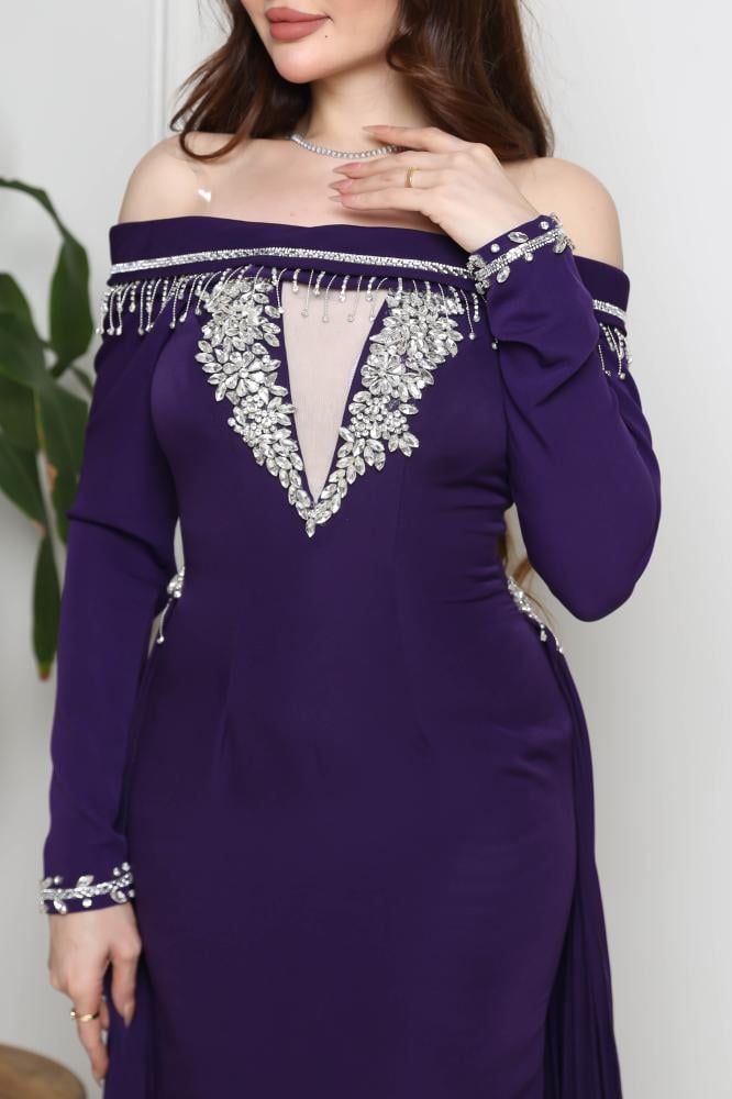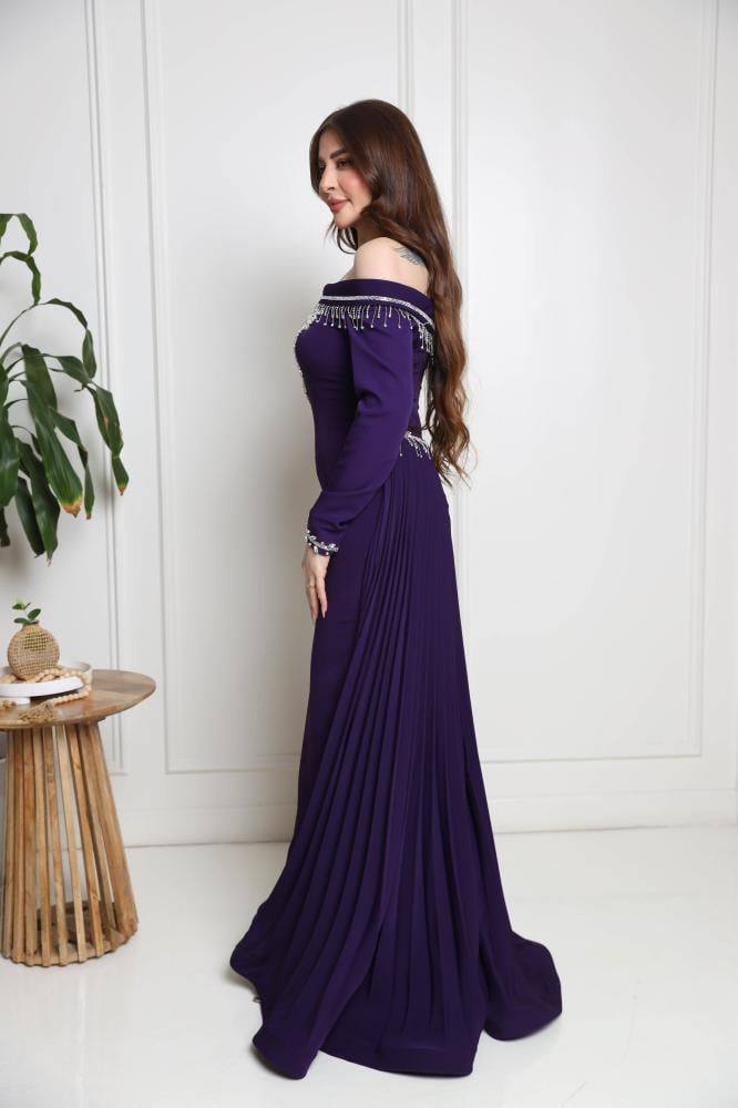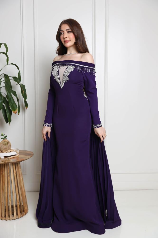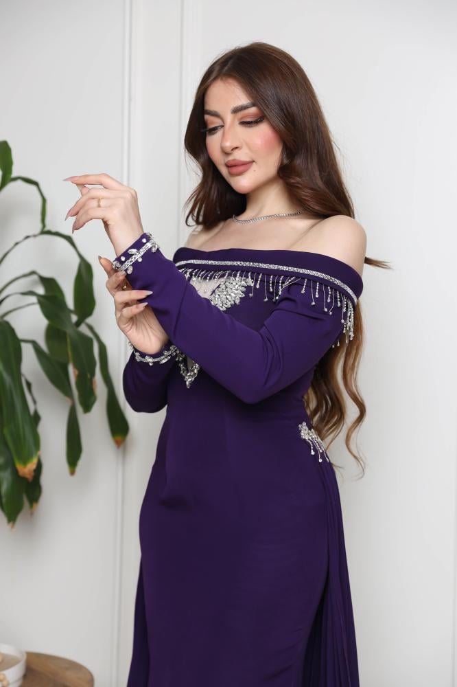 تألقي بإطلالة ساحرة تعكس الرقي والفخامة مع هذا الفستان المصنوع من خامة الباربي الفاخرة باللون البنفسجي الملكي. يتميز بتصميم أوف شولدر جذاب وتطريز كريستالي لامع يزين الصدر والأكمام، بالإضافة إلى لمسات انسيابية من الخلف تضيف له طابعًا ملكيًا. قصته الواسعة تمنحك حضورًا لافتًا في السهرات والمناسبات الخاصة.