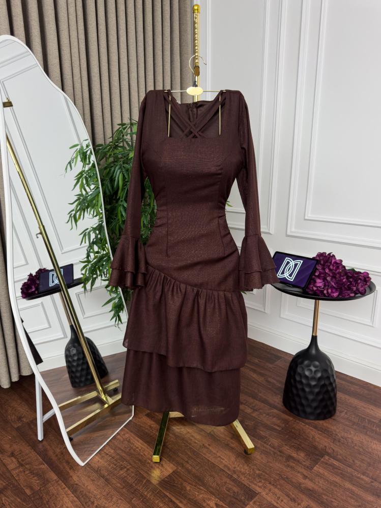 استمتعي بإطلالة تجمع بين النعومة والتميّز مع هذا الفستان البني الأنيق المصمم بقصة جذابة تبرز تفاصيل القوام. يتميز بتفاصيل الطبقات في التنورة التي تضيف حركة وأناقة، مع أكمام طويلة تنتهي بكشكش ناعم لمظهر أنثوي فريد. الرقبة المربعة مع التصميم المتقاطع من الخلف تعطي لمسة عصرية تزيد من فخامة الإطلالة.