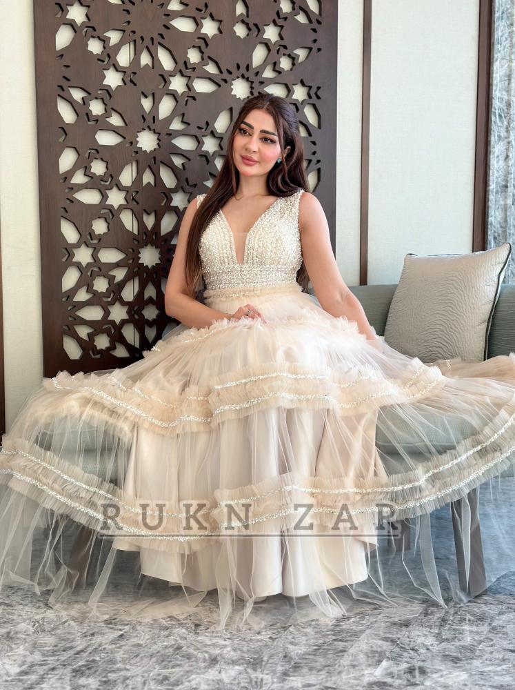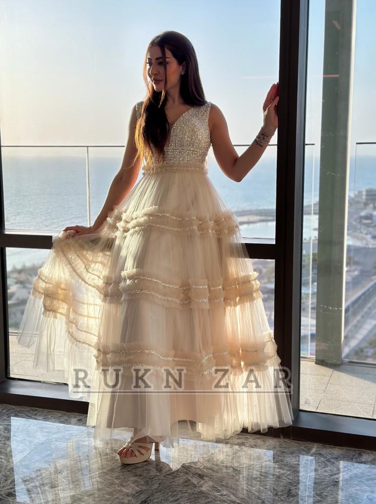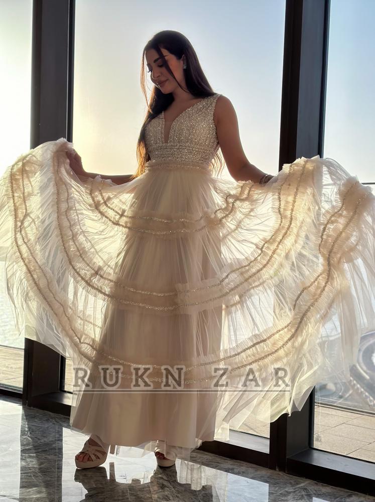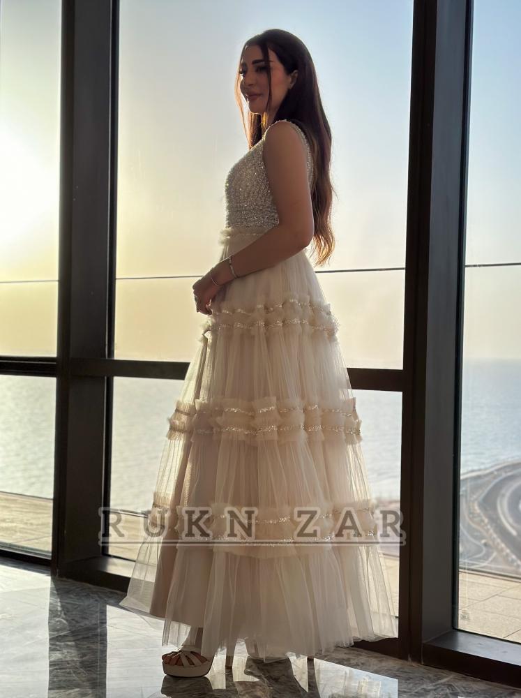 فستان سهرة تل طبقات بقصة صدر انيقة مطرزة بالكرستال .