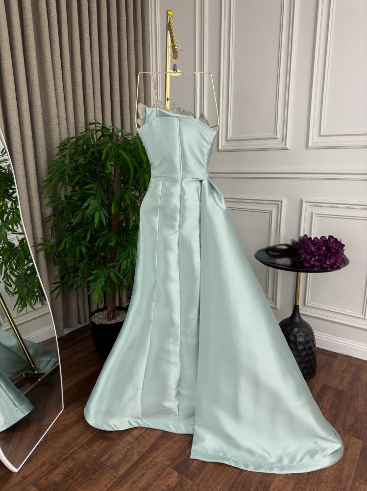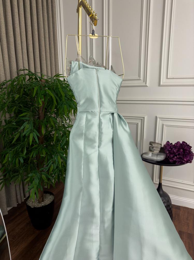 فستان سهرة راقي بخامة الميكادو الأنيقة باللون الأخضر الفاتح، مع تطريز ساحر من الترتر والفصوص، مثالي لإطلالة ساحرة في كل مناسباتك.