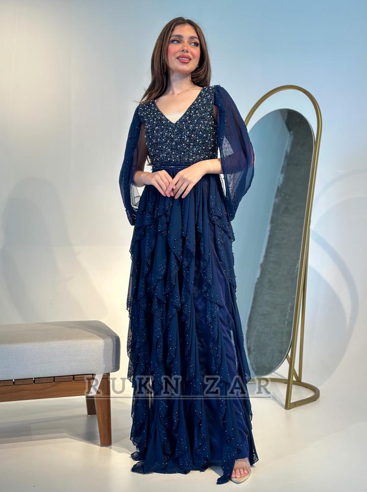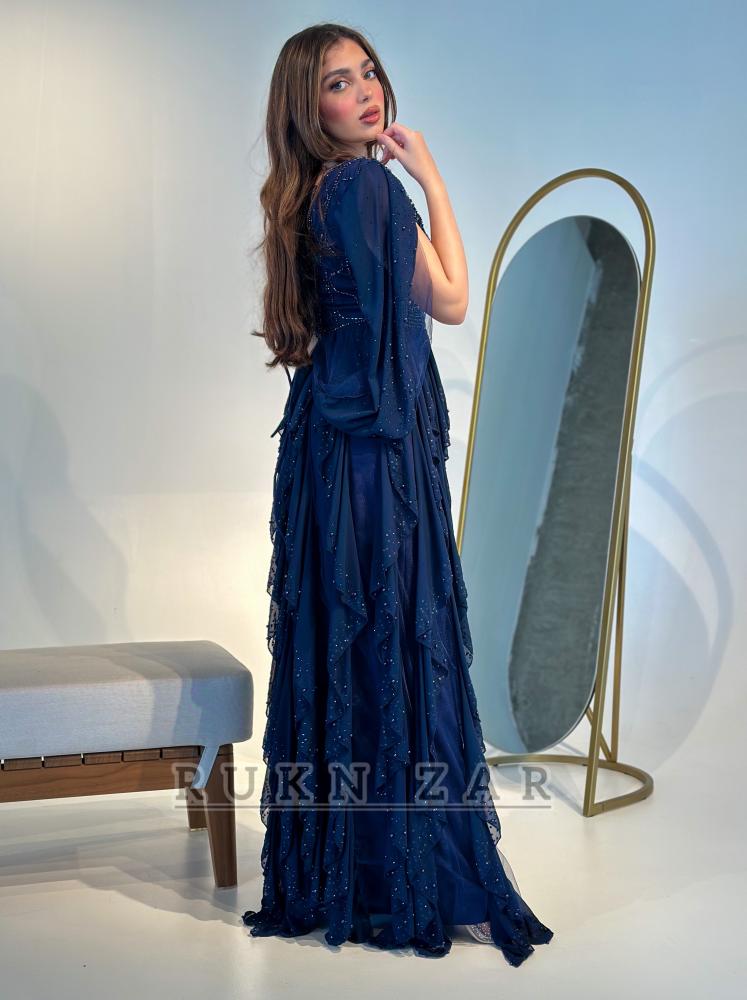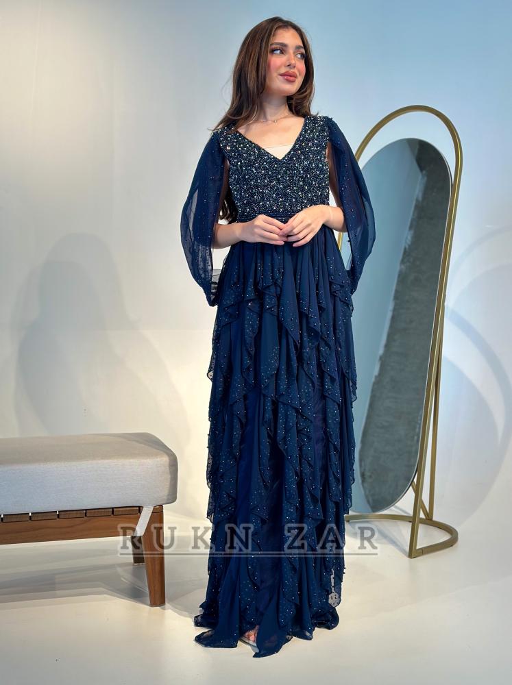 فستان سهره كحلي مطرز يدوياً بالكرستال , قصة رائعه لتنورة الفستان تعطي طابعاً حيوياً.