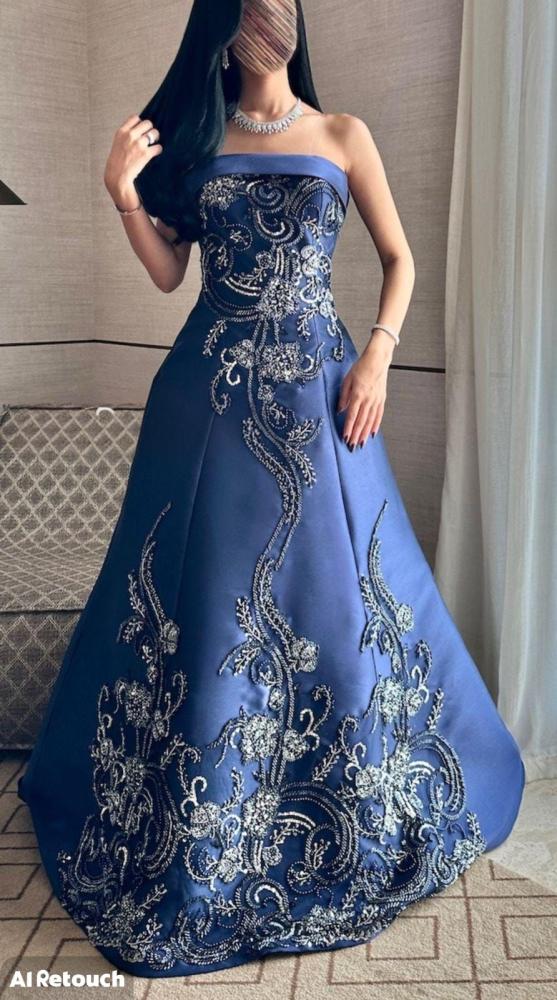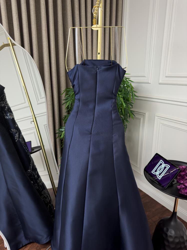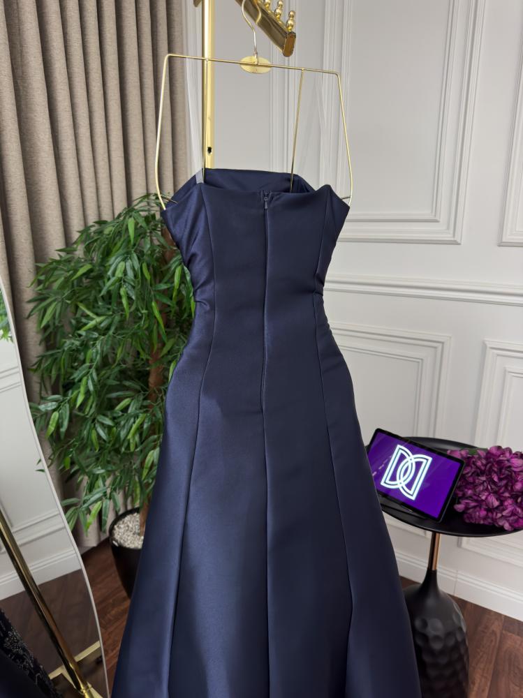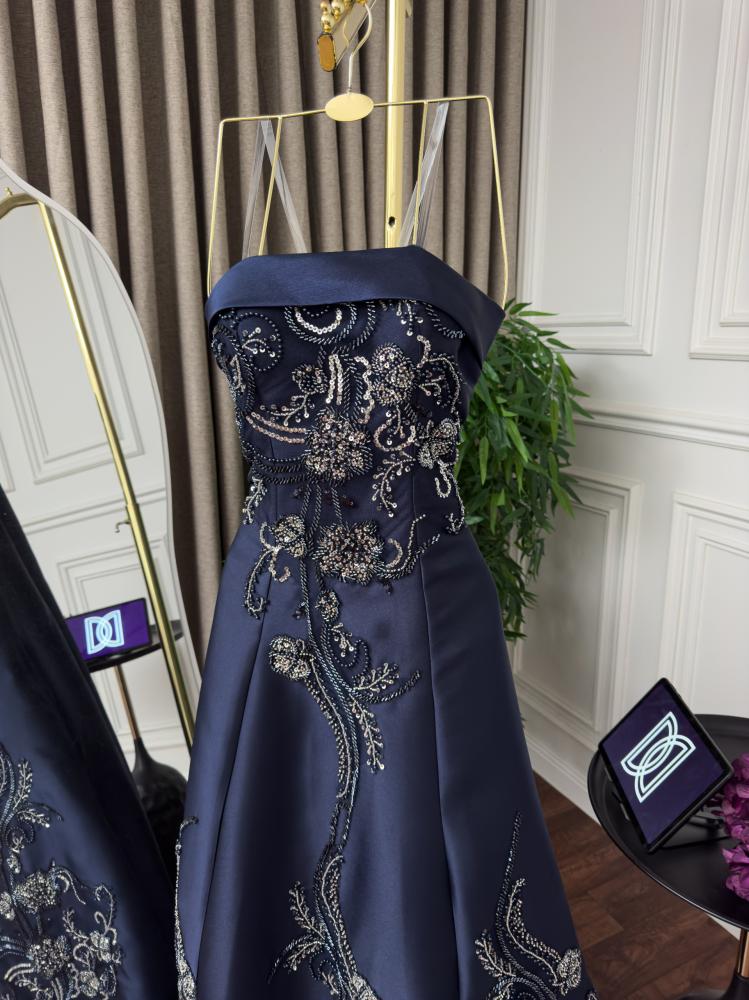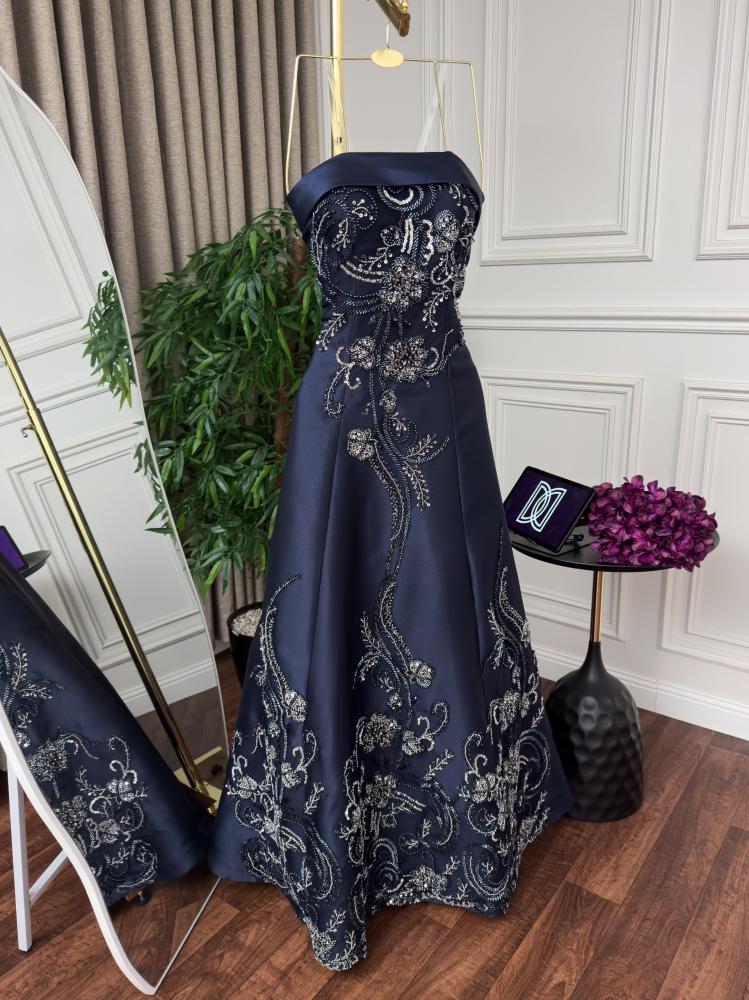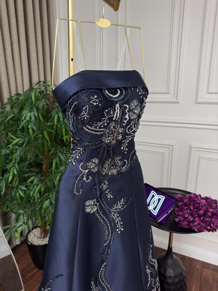 فستان سهرة ميكادو باللون الكحلي بكلفة مطرزة فخمة تعطي تصميم ملكي وفخم للفستان .