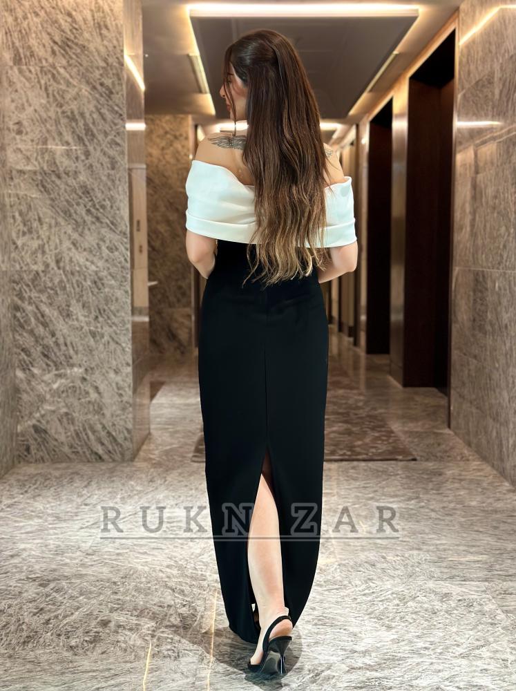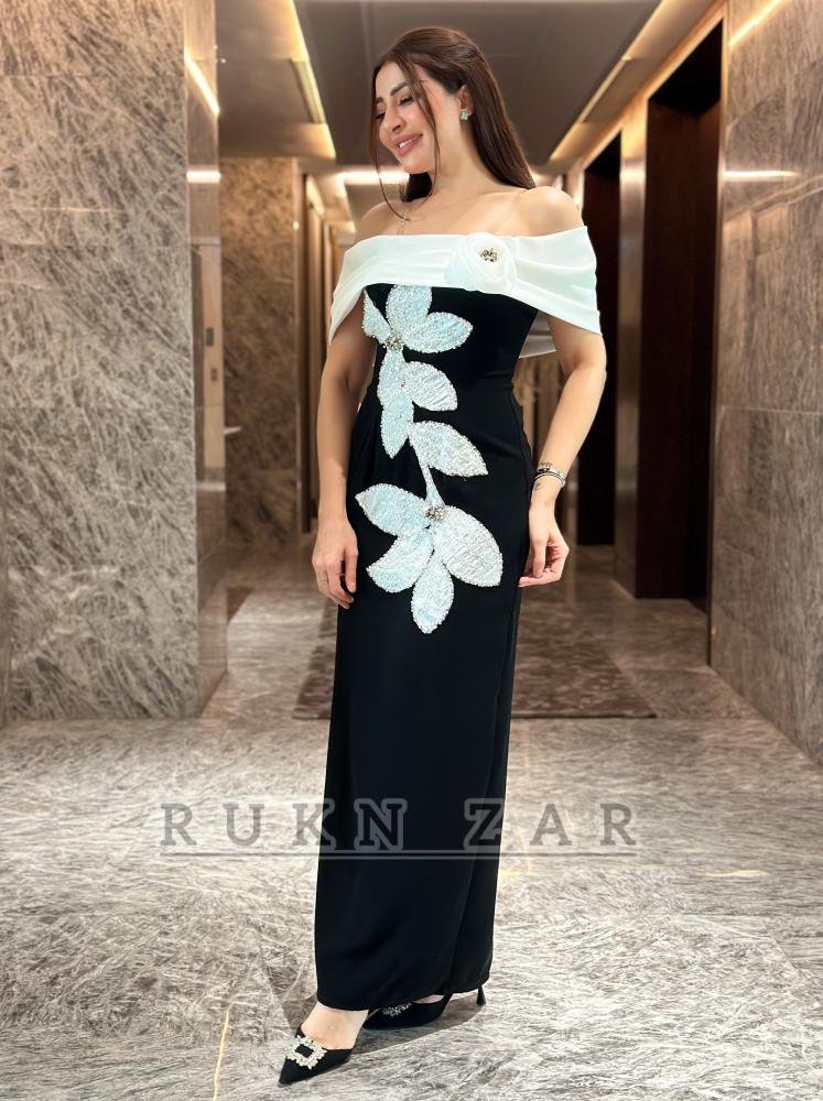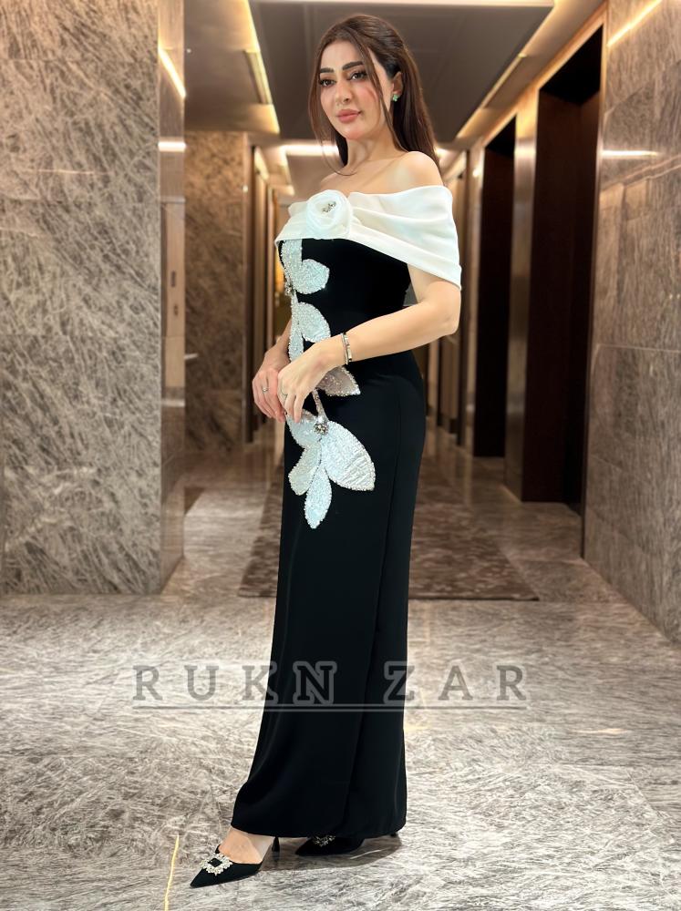 فستان سهرة كريب مع كلفة انيقة مطرزه بالكرستال والبروشات.