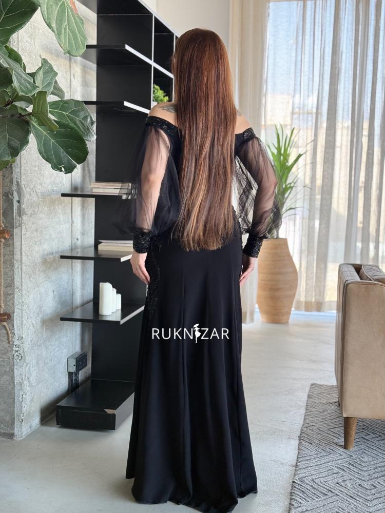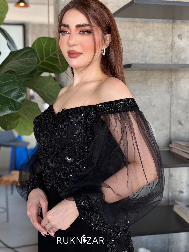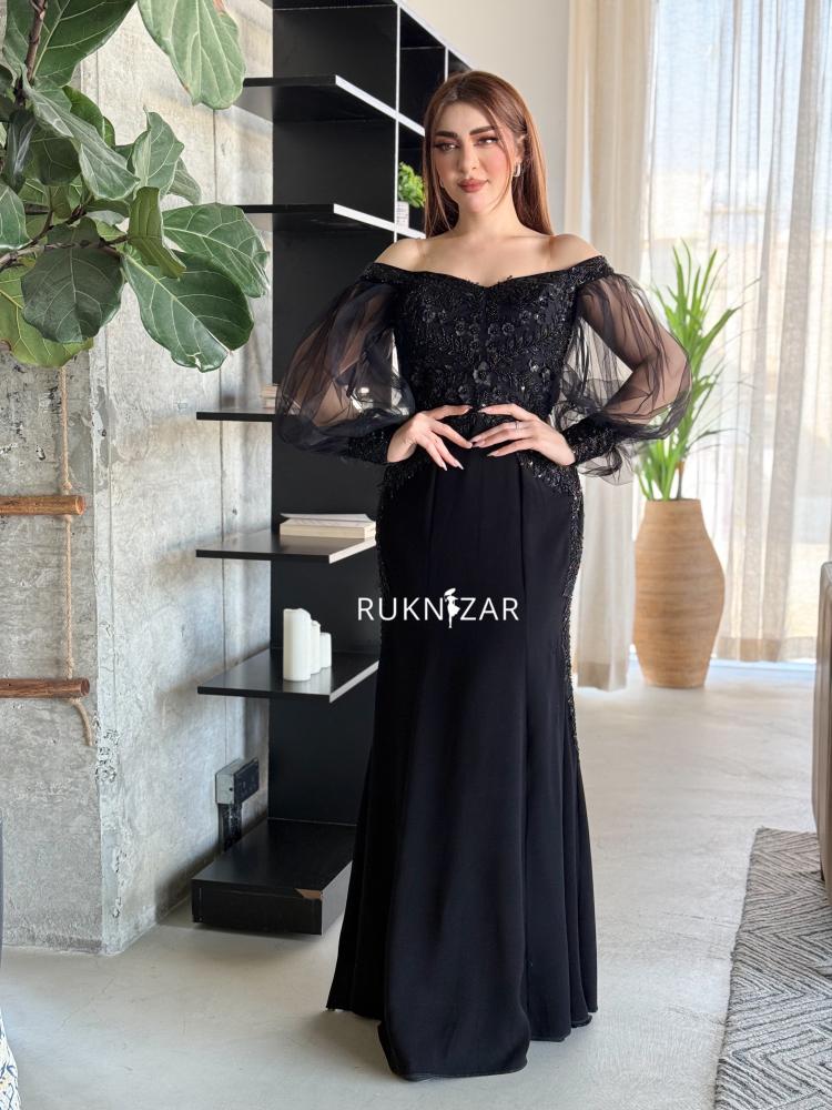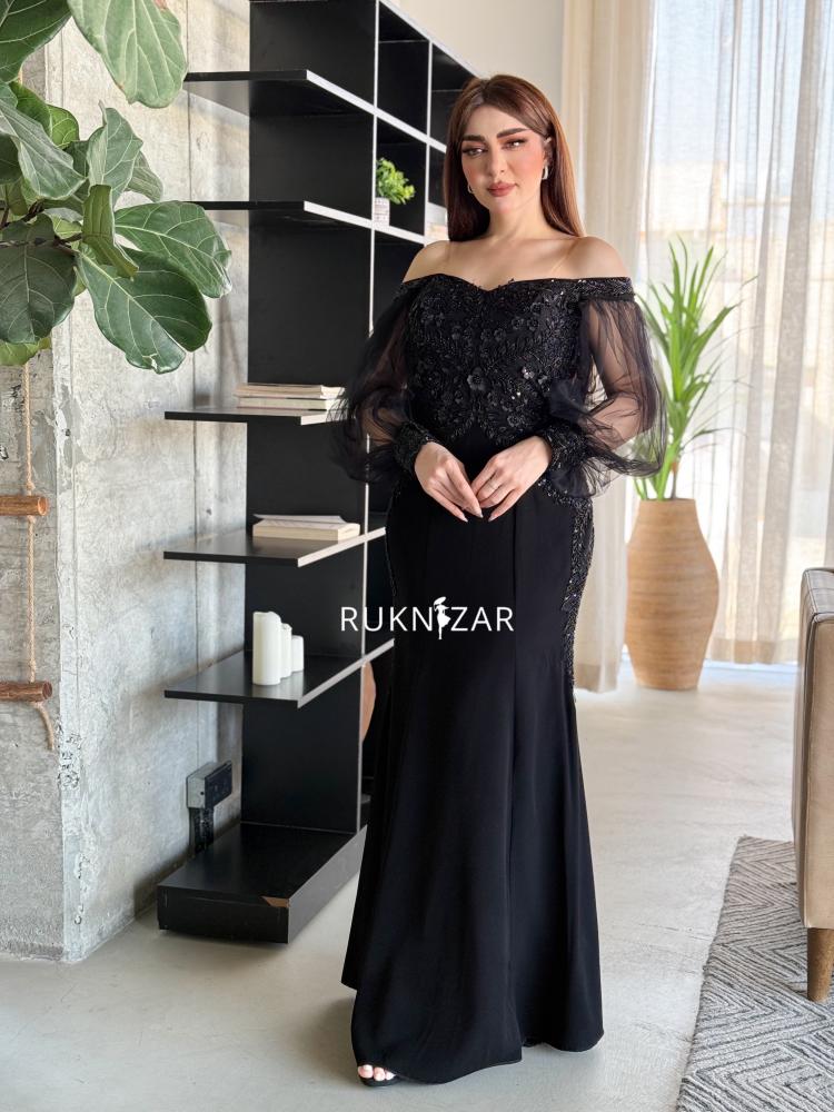فستان أسود سهرة ناعم من الكريب بقصة صدر راقية وأوف شولدر ساحرة، مطرز بالفصوص والكريستال يضيف لمسة أنيقة لإطلالتك في كل المناسبات.