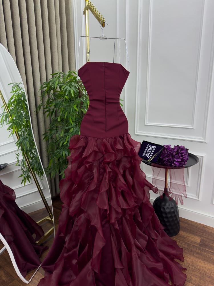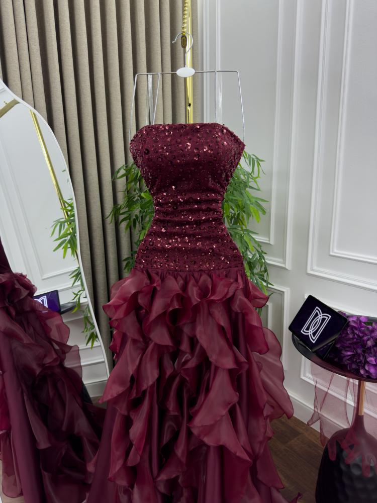 فستان سهرة بلون عنابي بترتر وجازار متدرج ✨
