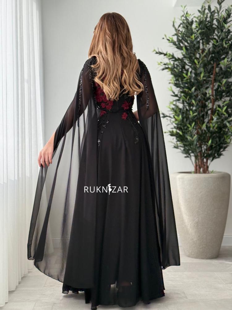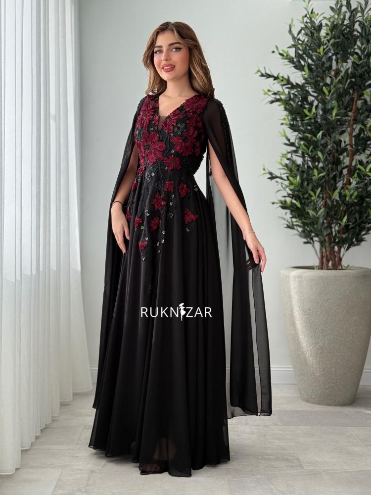 إطلالة فاخرة تجمع بين الرقي والجاذبية مع هذا الفستان الأسود المصنوع من خامة الشيفون الانسيابي، والمزين بتطريز أنيق على الصدر والخصر برسومات ورود باللون الأحمر تضيف لمسة رومانسية ساحرة. الأكمام الطويلة المفتوحة تمنحك حضورًا ملكيًا لافتًا، ليكون خيارًا مثاليًا للسهرات والمناسبات المميزة.