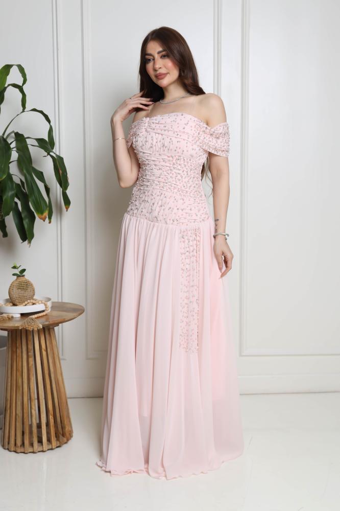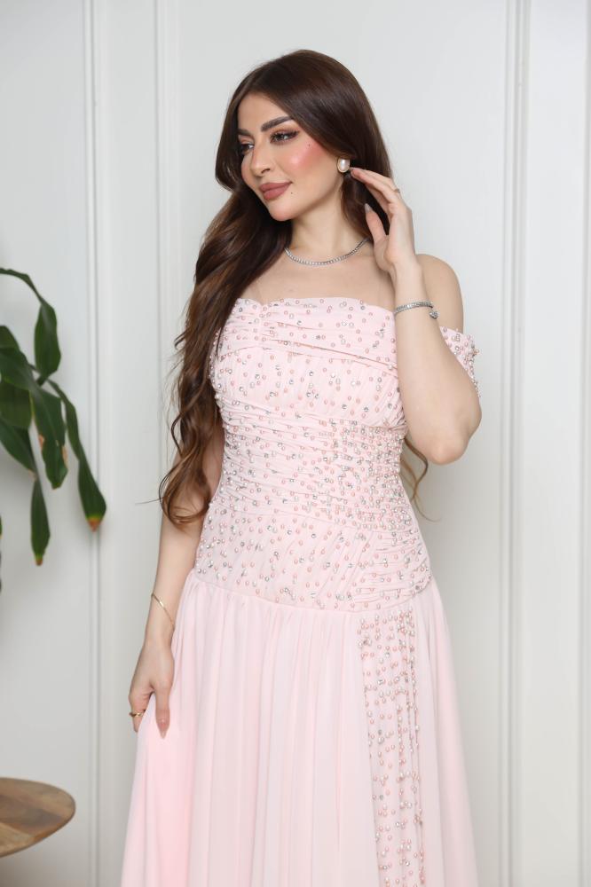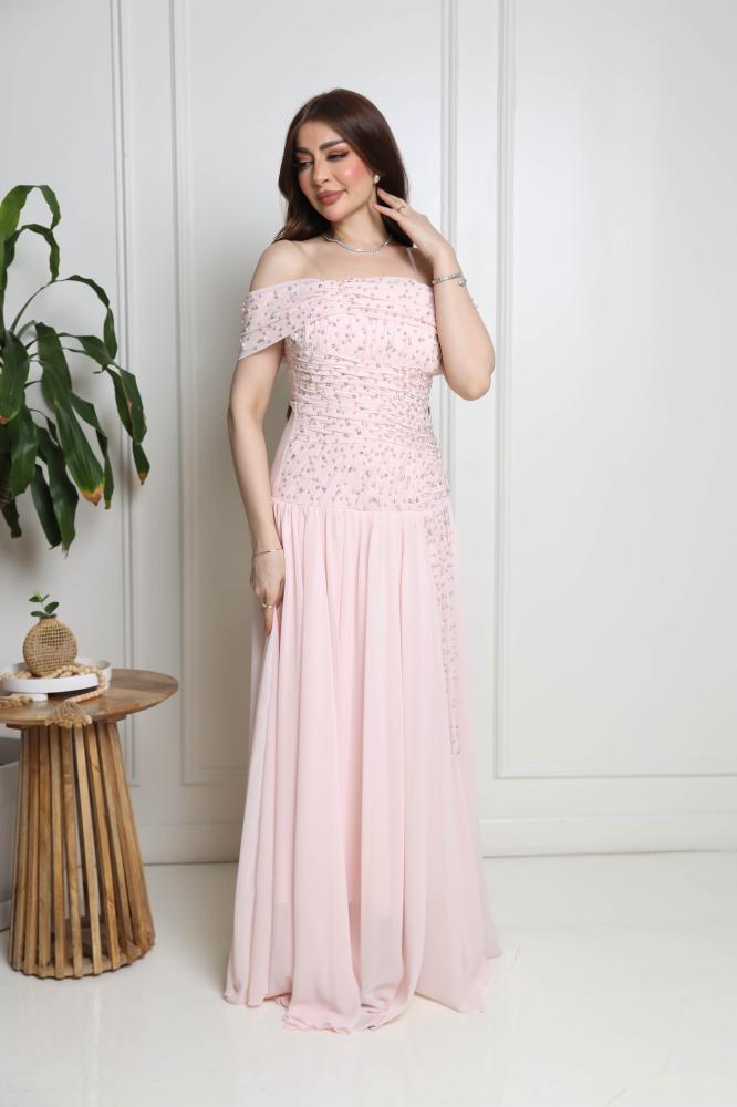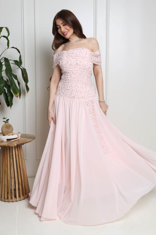 تألقي بإطلالة ساحرة تنبض بالأنوثة مع هذا الفستان المصمم من خامة الشيفون الانسيابية بلونه الوردي الهادئ. يتميز بتصميم كب يبرز جمال الأكتاف، وتطريز كريستالي متناثر يضفي لمسة فخمة على كامل الفستان. القصة الانسيابية الناعمة تمنحك حضورًا ملفتًا في جميع المناسبات الراقية.