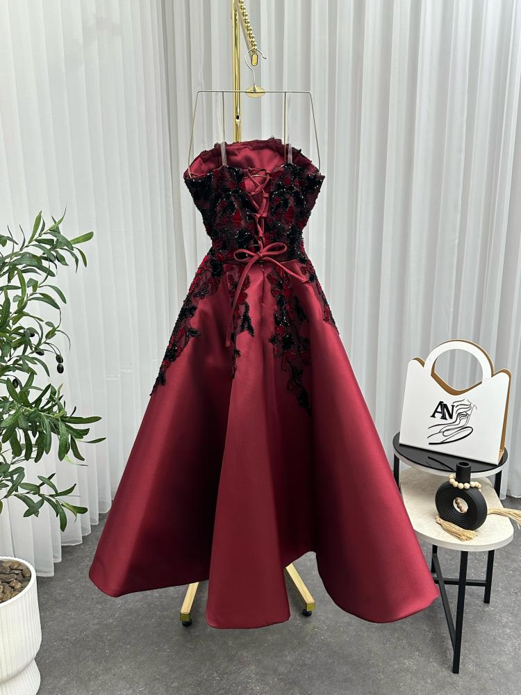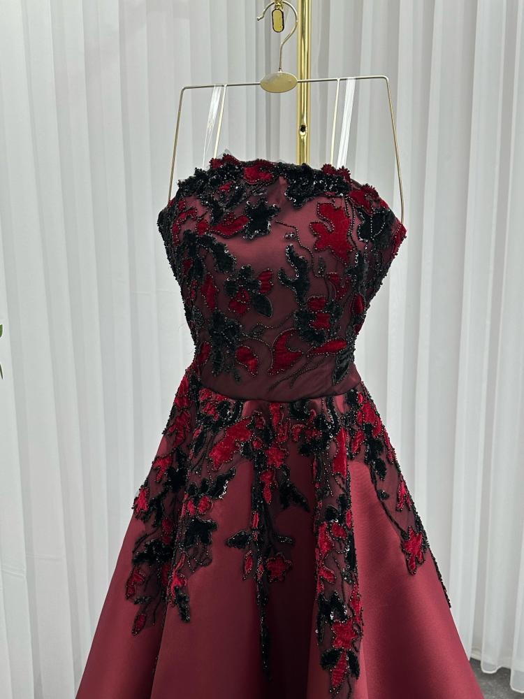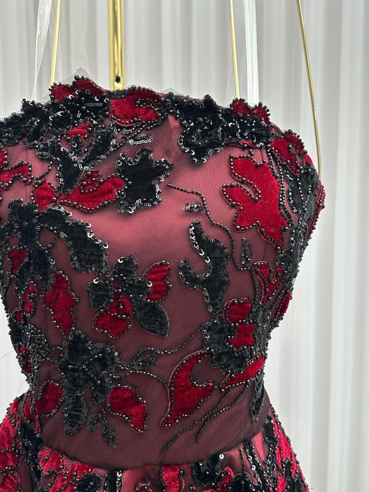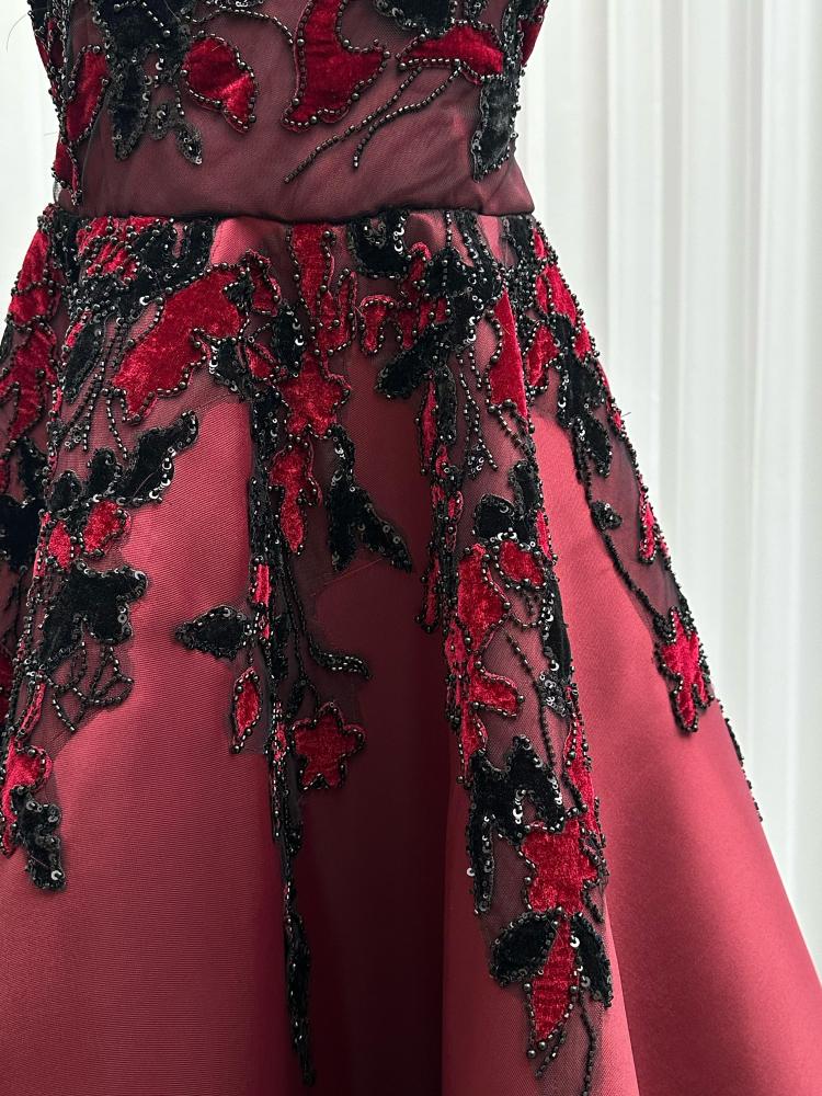 فستان فاخر بلون عنابي أنيق، مصنوع من خامة الميكادو الفخمة التي تمنح التصميم ثبات وأناقة. يزدان الفستان بتطريز بارز من المخمل الأسود والمخمل الأحمر، يضفي لمسة فنية فريدة على الصدر والتنورة. يتميز بقصة A-Line واسعة وتصميم بدون أكتاف يبرز جمال الإطلالة برقي وفخامة.