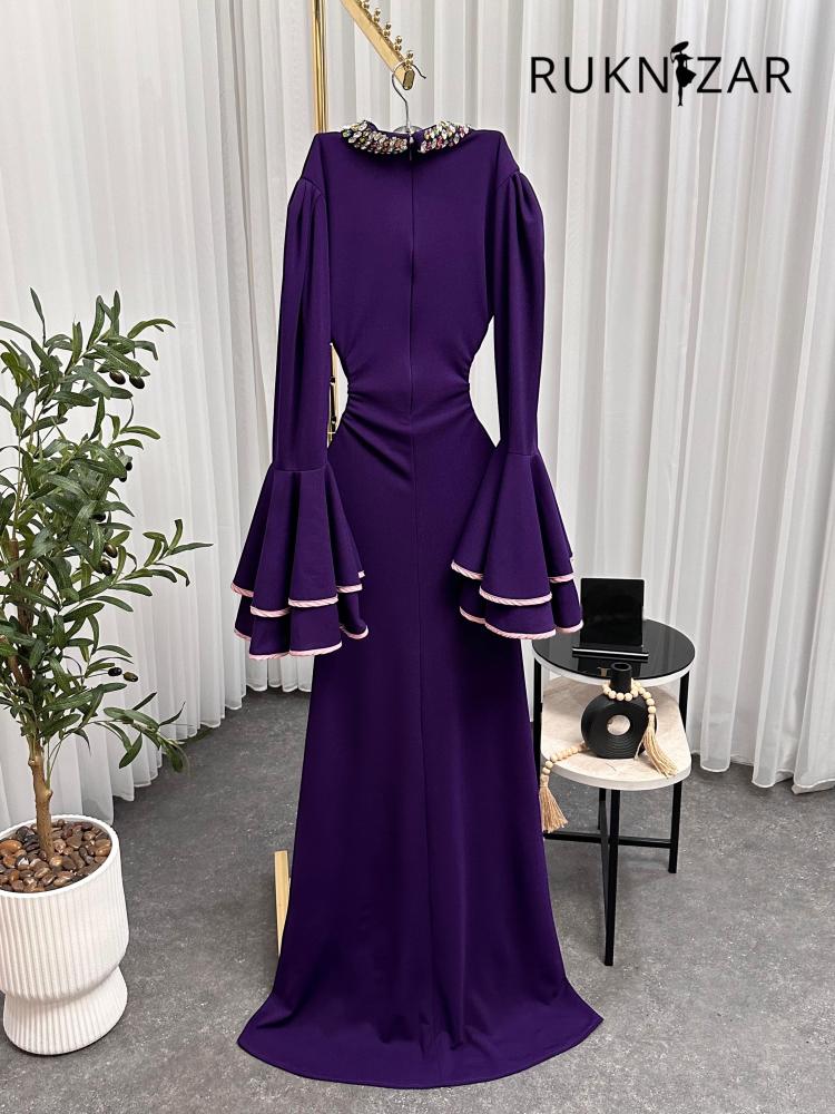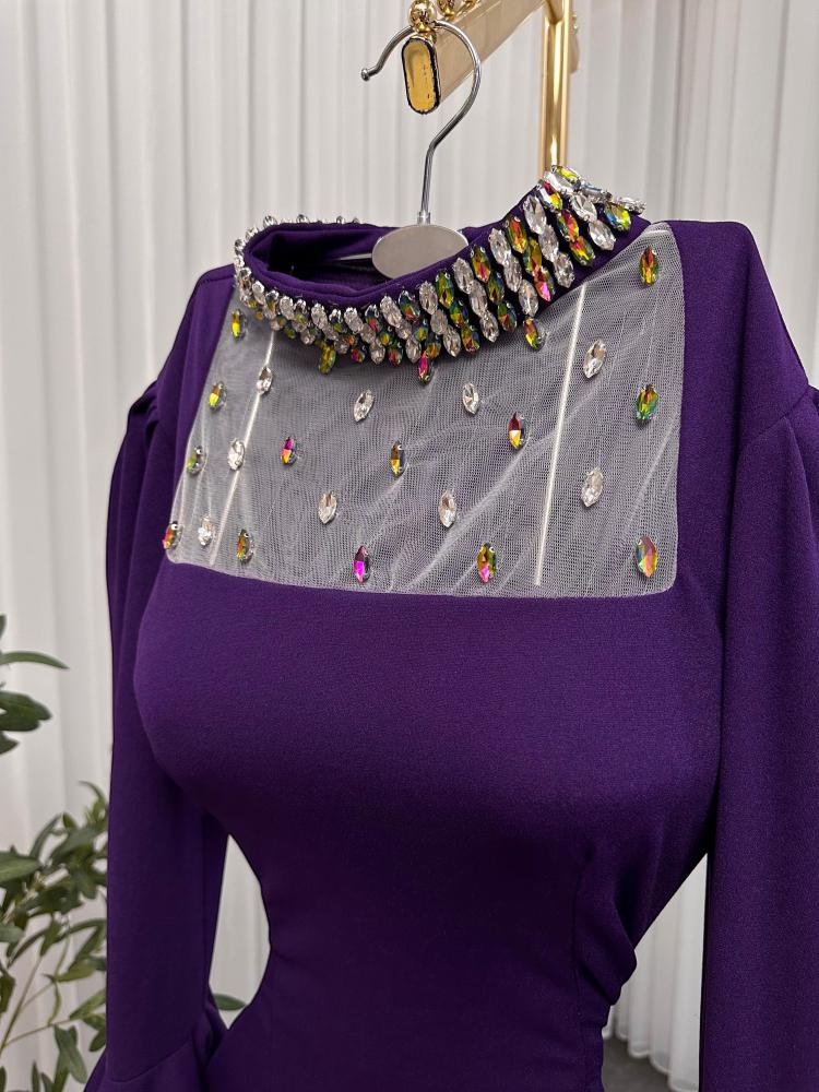 نوع التصميم : تصميم بياقة عالية مغطاة بالتل ومزينة بالكرستال الملون .