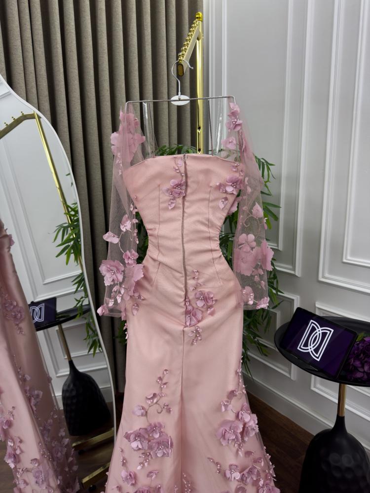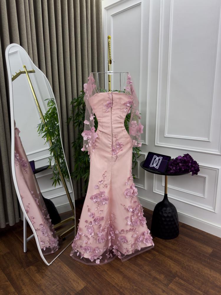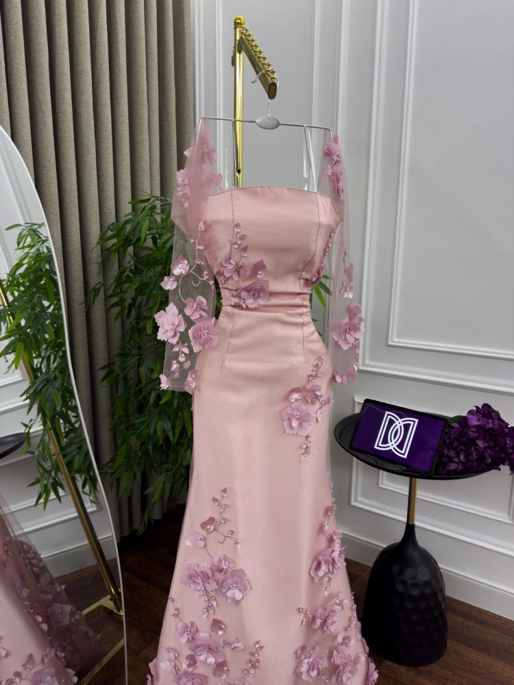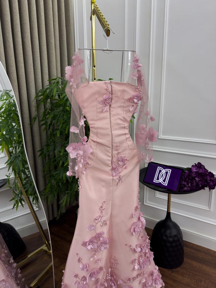 تألقي بإطلالة فريدة مع هذا الفستان الملكي المصنوع من خامة الميكادو الفاخرة، بلونه الوردي الناعم وتطريزات الزهور الثلاثية الأبعاد التي تمنحه لمسة أنثوية حالمة. تصميمه الأنبوبي مع أكمام شفافة مزينة بالورود يضيف لمسة من الرقي والفخامة، ليجعله الخيار المثالي لحفلات الزفاف والمناسبات الراقية.