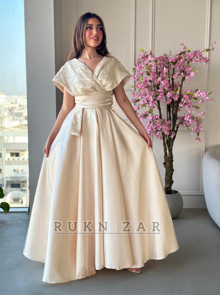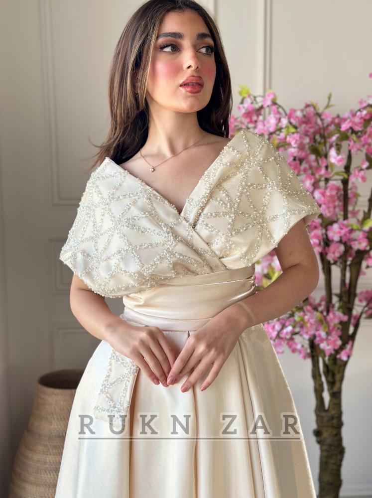 فستان سهره سكري راقي مع قصة صدر رائعه مرصعه بالفصوص لتعطي منظراً رائعاً .